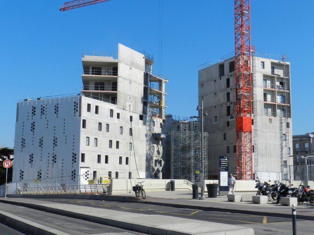 Échafaudage nécessaire à la réalisation du bâtiment pont du complexe architectural « Hôtel St-Roch – Belaroia » à Montpellier, le mardi 24 juillet 2018. Copyright : Anje34