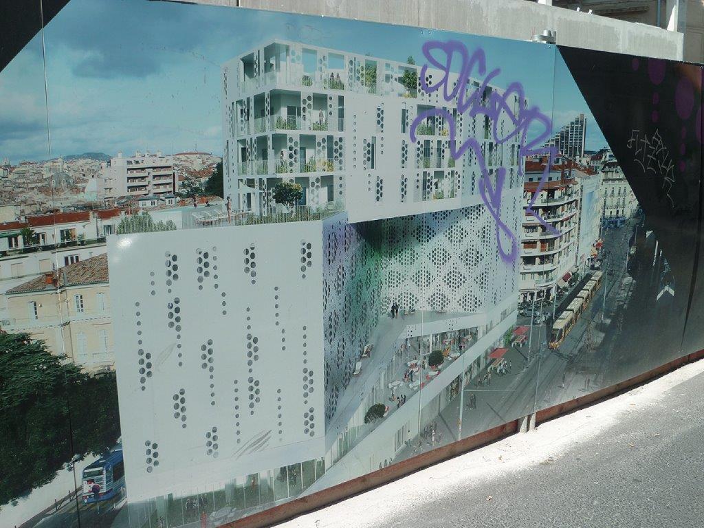 Visuel de l’ensemble architectural en construction « Hôtel St-Roch – Belaroia » photographié rue Jules-Ferry à Montpellier, le dimanche 29 juillet 2018. Copyright : Edouard Paris