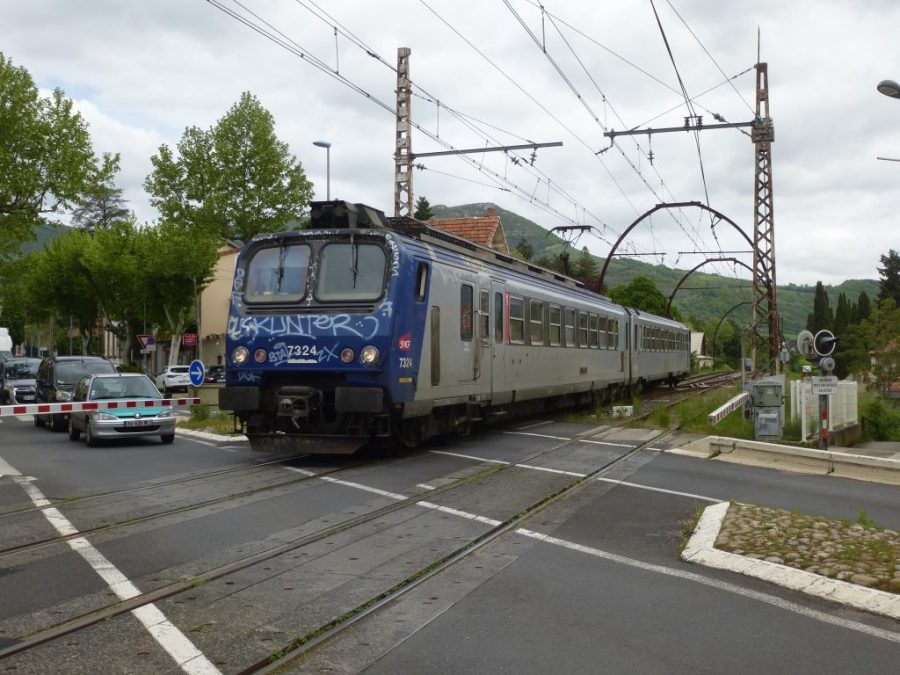 A l’approche de la gare de Millau, l’automotrice Z2 7324 est photographiée au moment où elle franchit le passage à niveau qui sépare l’avenue de la République de l’avenue Charles-de-Gaulle, le jeudi 10 mai 2018. Copyright : Michel Bozzola