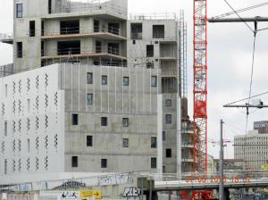 Le temps caniculaire qui sévit sur la métropole montpelliéraine depuis une semaine aurait-il eu raison d’une partie des éléments décoratifs en acier laqué blanc qui recouvrent peu à peu les façades du complexe architectural « Hôtel St-Roch – Belaroia » en cours de construction face au nouveau parvis de la gare de Montpellier Saint-Roch, en bordure duquel circulent les rames opérant sur les lignes 2 et 4 de tramway.