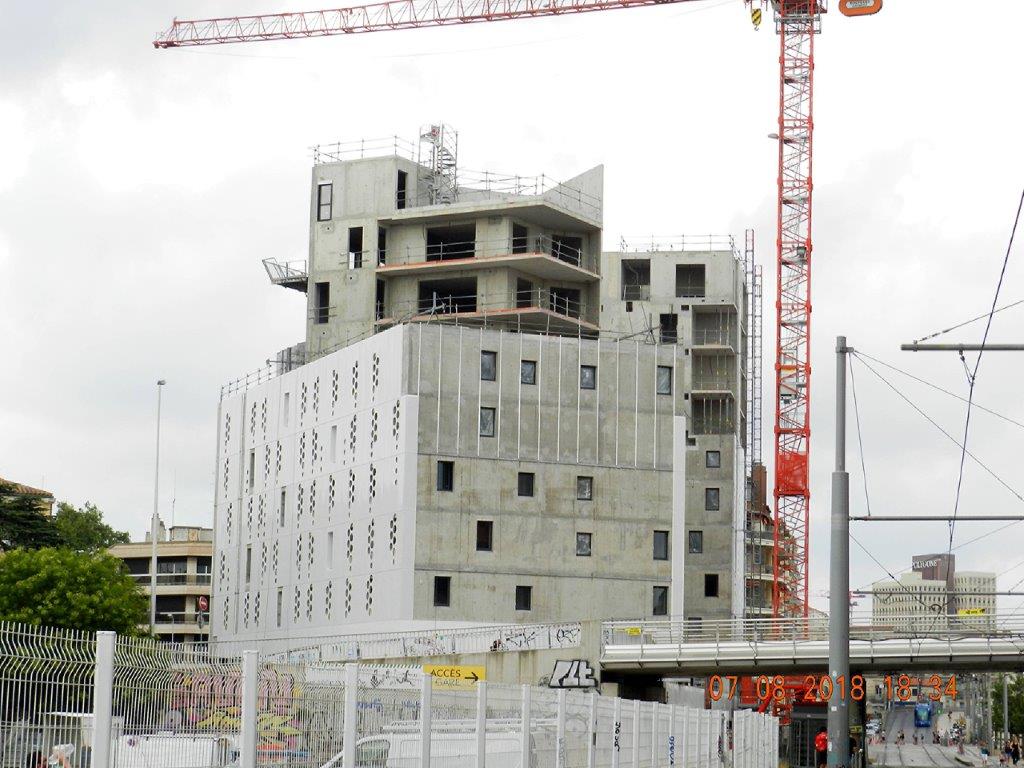 Chantier « Hôtel St-Roch – Belaroia » à Montpellier, la façade côté Pont-de-Sète a perdu la presque totalité de ses éléments décoratifs en acier laqué blanc. Photo prise le mardi 7 août 2018 à 18h34. Copyright : Anje34