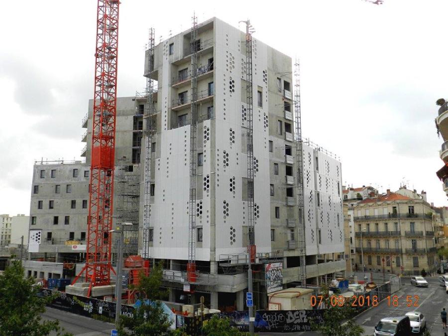 Vue du chantier « Hôtel St-Roch – Belaroia » depuis la terrasse de la gare de Montpellier Saint-Roch donnant sur la rue Jules-Ferry, le mardi 7 août 2018. Copyright : Anje34