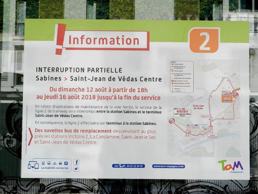 Information relative à l’interruption de toute circulation des rames de tramway sur la ligne 2 entre la station « Sabines » et le terminus « Saint Jean de Védas – Centre » du dimanche 12 août 18h00 au jeudi 16 août 2018 inclus. Photo prise à la station « Nouveau Saint-Roch », le vendredi 10 août 2018. Copyright : Anje34