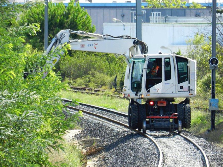 Un chargeur/pelle rail-route de la société ETF à l’ouvrage entre les stations « Saint Jean le Sec » et « La Condamine », le mardi 14 août 2018. Copyright : Anje34