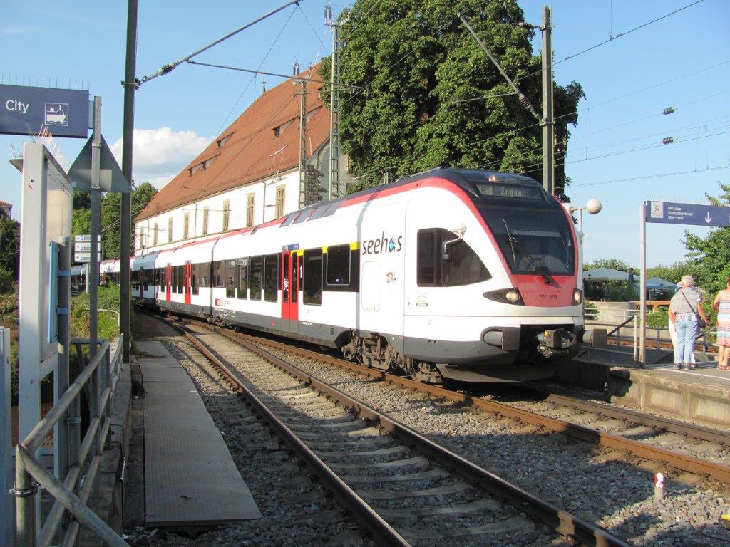 Une unité multiple de rames Flirt des chemins de fer fédéraux suisses (CFF SBB FFS), opérant sur la ligne ferroviaire allemande Ergen – Konstanz, dont la branche allemande SBB est en charge de son exploitation, est photographiée à l’approche de la gare de Constance, le mercredi 15 août 2018. Copyright : Edouard Paris