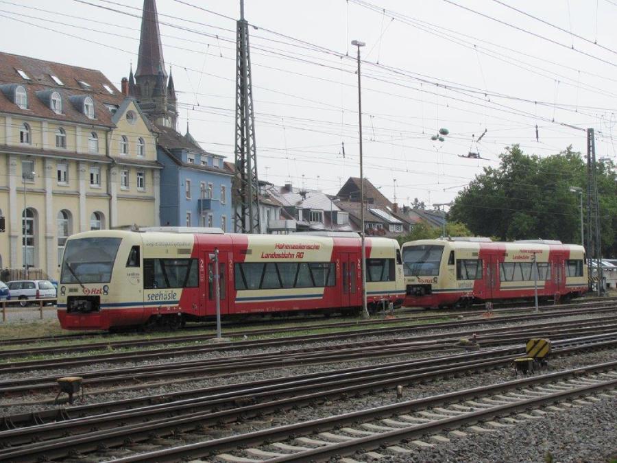 Deux autorails Regio-Shuttle Stadler série 650 de la compagnie HzL garés en gare de Radolfzell (Allemagne), le samedi 18 août 2018. Ces autorails opèrent sur la ligne ferroviaire Radolfzell – Stockach. Copyright : Edouard Paris
