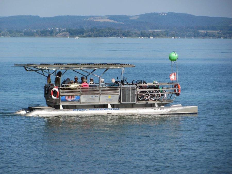 Sur le lac inférieur de Constance, une embarcation propulsée par l’électricité d’origine solaire assure la navette entre Mannenbach (Suisse) et l’ïle de Reichenau (Allemagne) pour les piétons et cyclistes. Photo prise le jeudi 16 août 2018. Copyright : Edouard Paris
