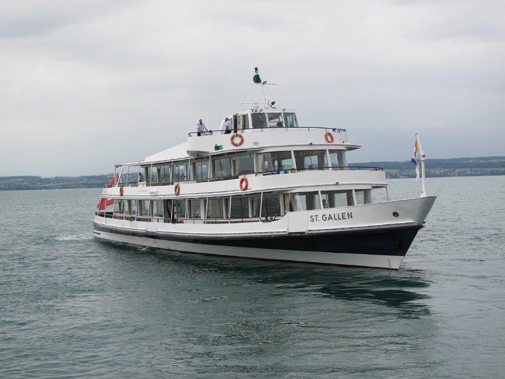 Le navire MS St Gallen (année 1967) de la compagnie SBS quitte le port de Meersburg (Allemagne) à destination de Rorschach (Suisse) via Kreuzlingen et Romanshorn (Suisse), le lundi 13 août 2018. Copyright : Edouard Paris