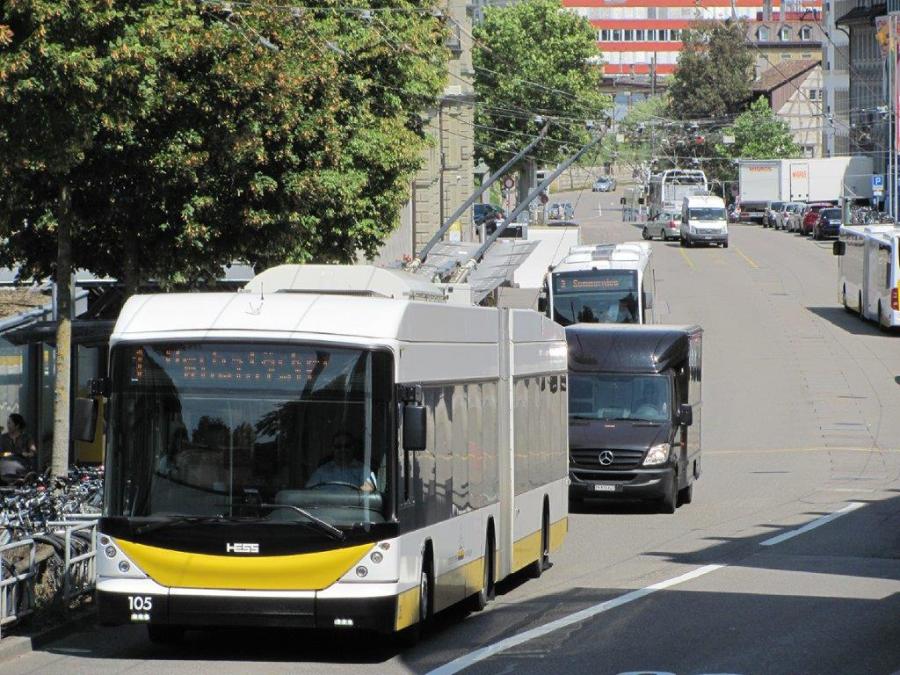 A Schaffhausen (Suisse), connue notamment par son attraction très touristique des chutes du Rhin, le trolleybus articulé 105 Swisstrolley 3 (année 2011) quitte l’arrêt « Gare » en direction du terminus « Herbstäcker » à Neuhausen, le vendredi 17 août 2018. Copyright : Edouard Paris
