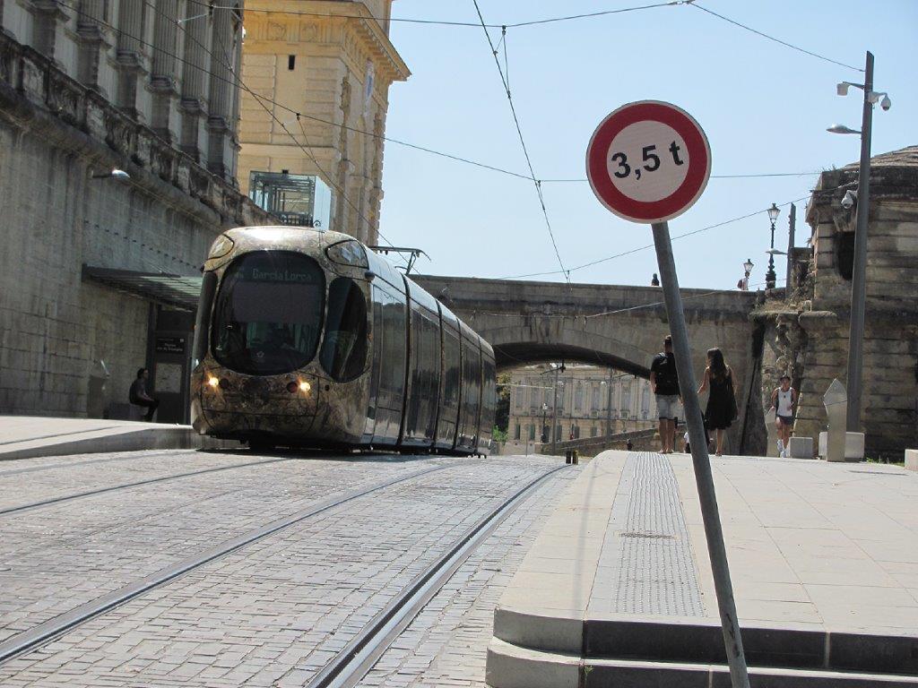 Boulevard du Professeur Louis-Vialleton à Montpellier, un panneau interdisant aux véhicules routiers de plus de 3,5 tonnes de circuler sur la plateforme pavée de la ligne 4 de tramway, dans le sens 4b, concerne en premier lieu les bus urbains des lignes 6 et 7, dont le poids unitaire à vide atteint les 12 tonnes. Photo prise le samedi 1er septembre 2018. Copyright : Edouard Paris