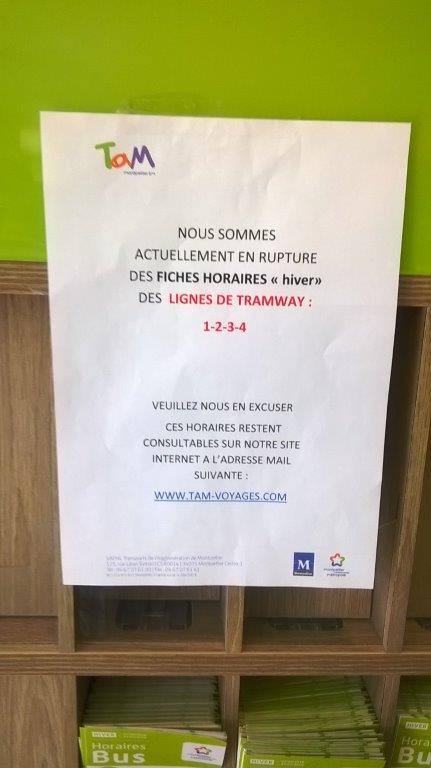 Fort heureusement, tramwaydemontpellier.net met à la disposition de ses visiteurs les fiches horaires des quatre lignes de tramway au format pdf. Photo prise le lundi 3 septembre 2018 dans un espace mobilité TaM Montpellier 3M. Copyright : Igor Pastramo