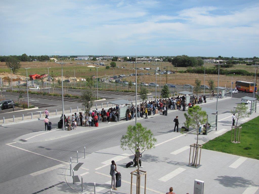 La foule sur le quai de la desserte du parvis sur de la gare de Montpellier Sud de France par la navette bus TaM Montpellier 3M, le samedi 15 septembre 2018 à 15h32. Au second plan de la photo, rue de la Fontaine de la Banquière, ça commence à bouchonner. Compyright : Edouard Paris