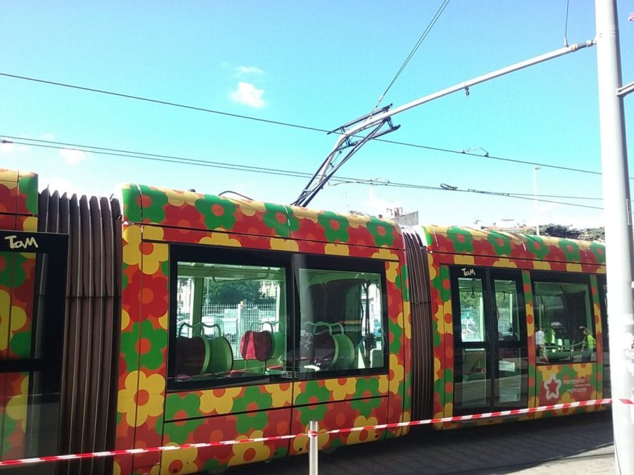 Le pantographe situé au-dessus du module central de la rame 2050 Citadis 302 Alstom est dans un triste état, tout comme le hauban du mât caténaire. Photo prise le lundi 17 septembre 2018, rue Alexandra David-Néel à Montpellier. Copyright : Miguel