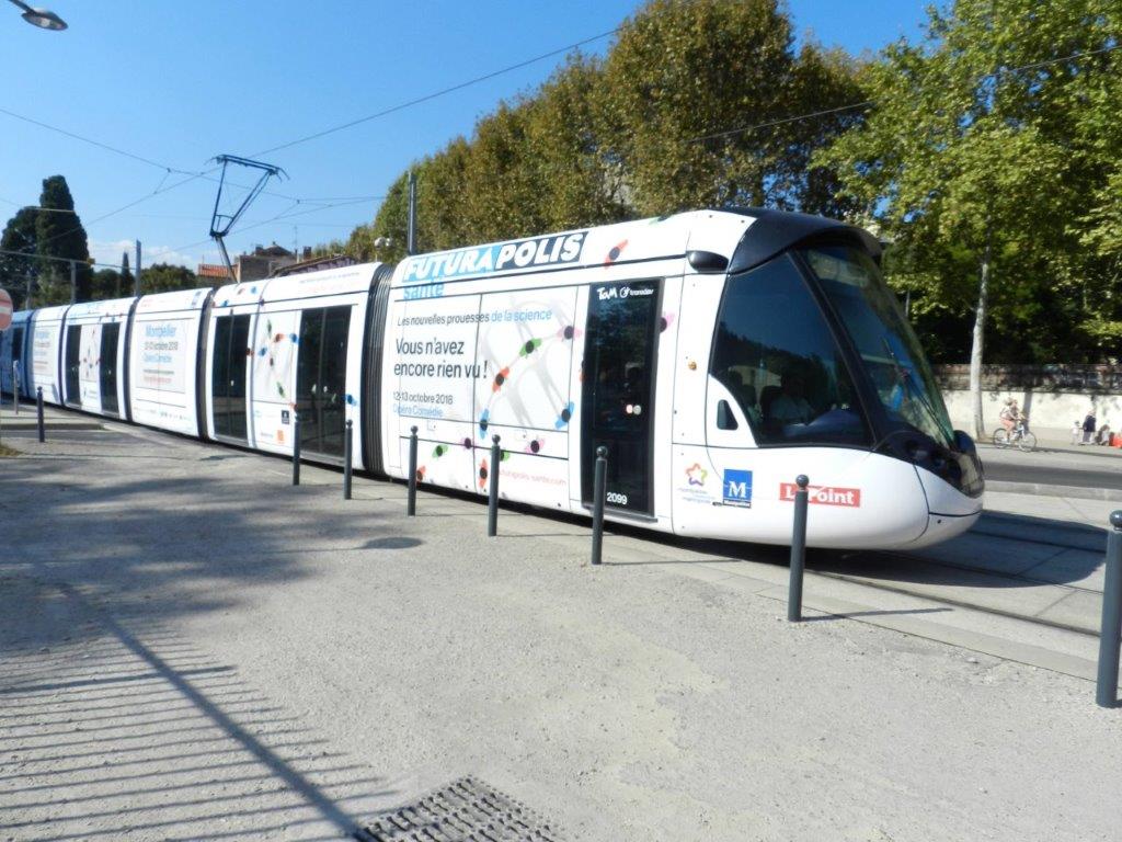 La rame 2099 Citadis 402 Alstom multiligne, intégralement pelliculée FuturaPolis Santé, est photographiée à l’approche de la station « Albert 1er – Saint-Charles » de la ligne 1, le jeudi 20 septembre 2018. Copyright : Anje34