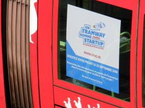 - Annonce de la deuxième édition de l’opération « Un Tramway Nommé Startup » appliquée sur une baie vitrée de la rame 2048 Citadis 302 Alstom photographiée le vendredi 21 septembre 2018. Copyright : Anje34