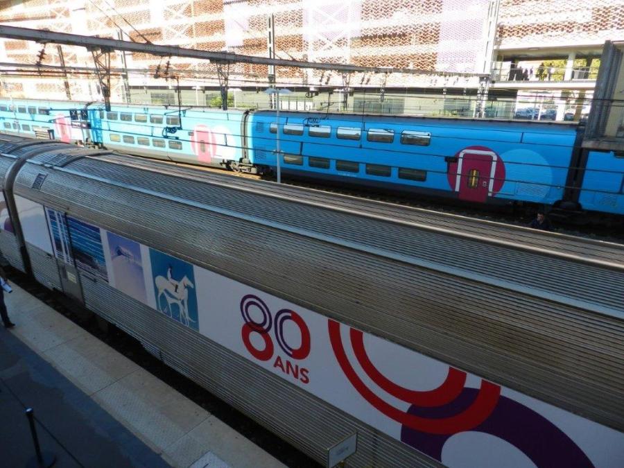 Des voitures inox Mistral 69 aptes à rouler à 160 km/h aux voitures d’une rame TGV Duplex Ouigo aptes à circuler à 320 km/h, un raccourci de la course à la vitesse sur rail en gare de Montpellier Saint-Roch, le vendredi 5 octobre 2018. Copyright : Anje34