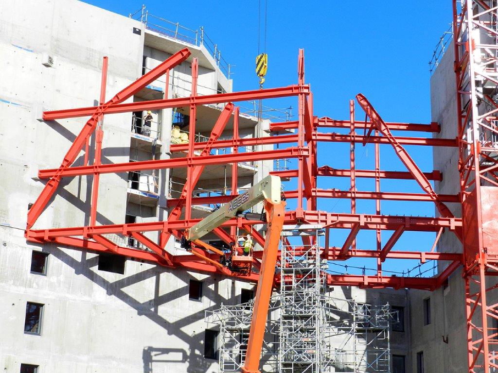 Gros plan sur l’assemblage des poutres en acier qui soutiendront le bâtiment pont de l’ensemble architectural « Hôtel St-Roch – Belaroia » à Montpellier, le vendredi 5 octobre 2018. Copyright : Anje34