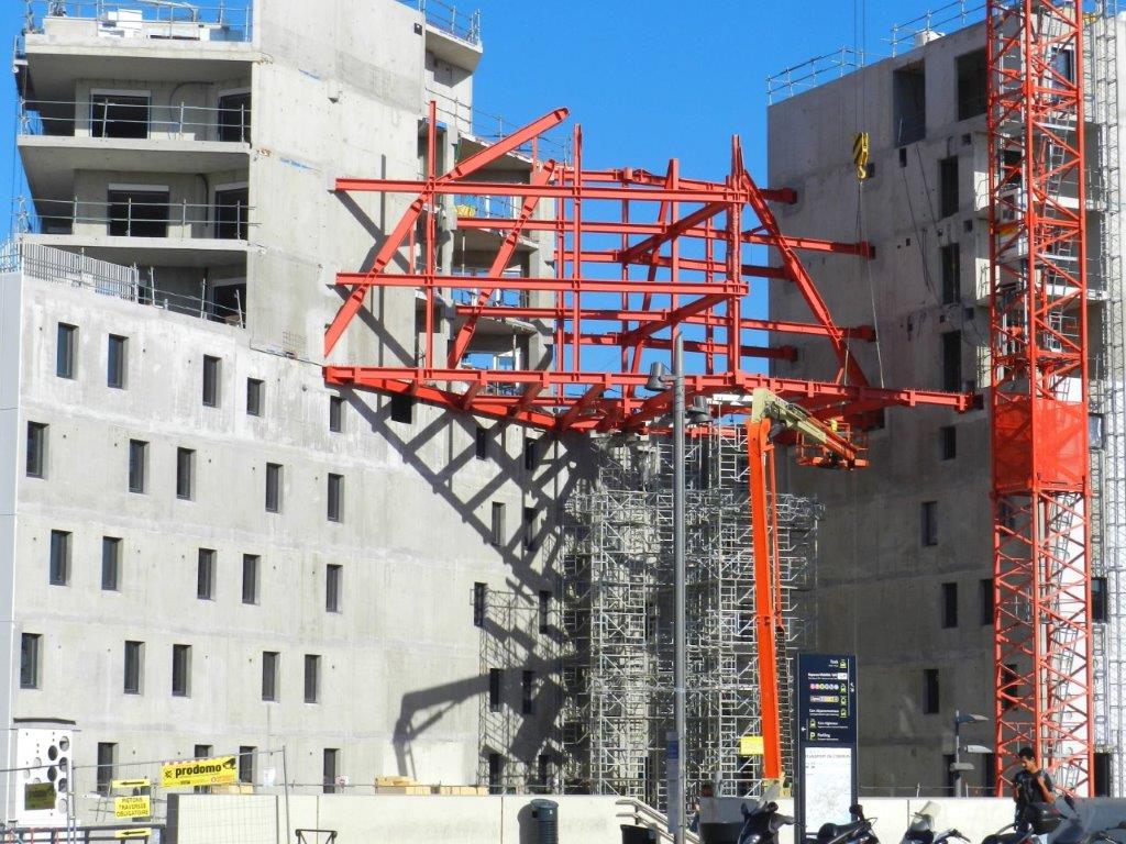 Vue sur les poutres en acier qui soutiendront le bâtiment pont de l’ensemble architectural « Hôtel St-Roch – Belaroia » à Montpellier, le vendredi 5 octobre 2018. Copyright : Anje34