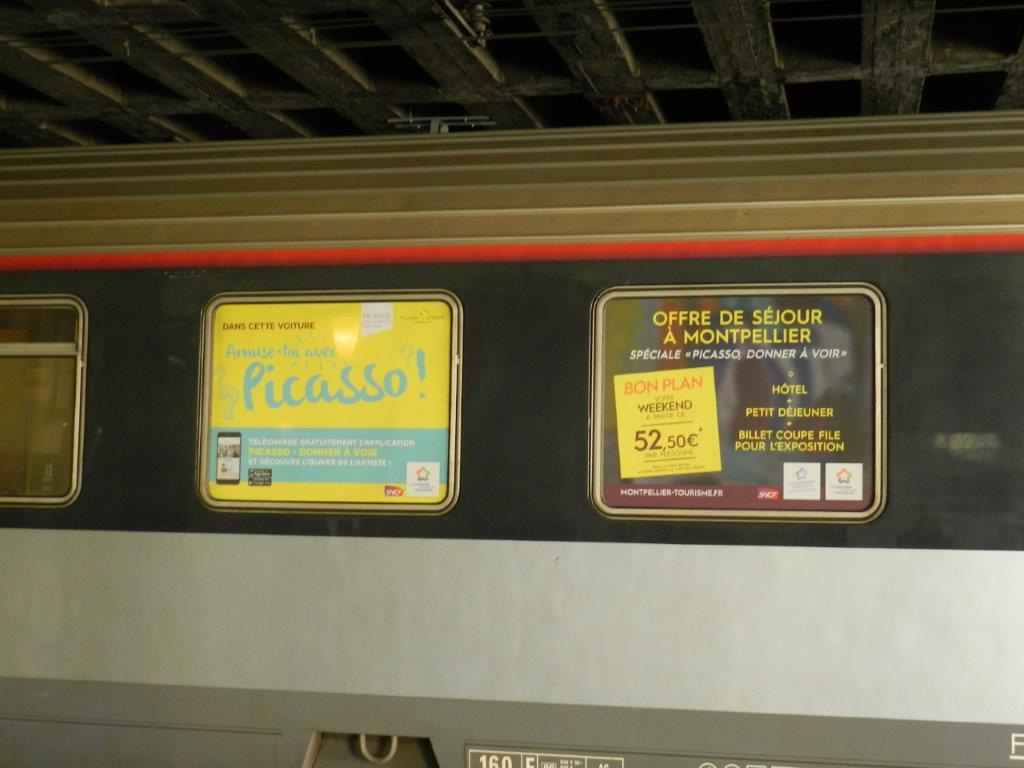 Près de deux semaines après la clôture de l’exposition « Picasso -Donner à Voir » au Musée Fabre de Montpellier, des voitures de l’Intercités 4760 Marseille – Bordeaux en assurent encore la promotion, ainsi qu’en atteste la photo prise le samedi 6 octobre 2018 à 11h58 en gare de Montpellier Saint-Roch. Copyright : Anje34