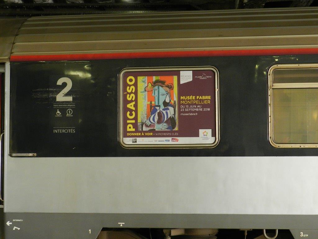 Près de deux semaines après la clôture de l’exposition « Picasso -Donner à Voir » au Musée Fabre de Montpellier, des voitures de l’Intercités 4760 Marseille – Bordeaux en assurent encore la promotion, ainsi qu’en atteste la photo prise le samedi 6 octobre 2018 à 11h58 en gare de Montpellier Saint-Roch. Copyright : Anje34