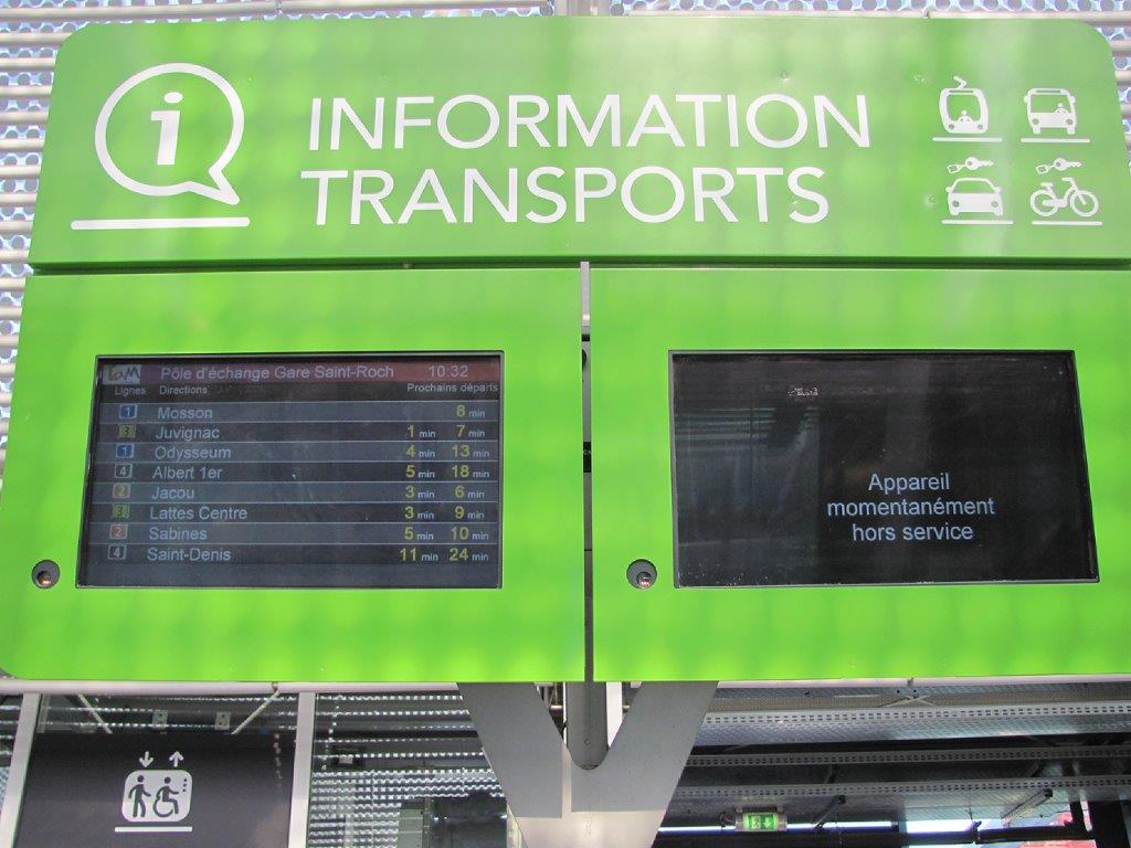 Information transports en gare de Montpellier Saint-Roch, trois mois après avoir été signalées, les anomalies n’ont toujours pas été corrigées. Photo prise le samedi 6 octobre 2018. Copyright : Edouard Paris