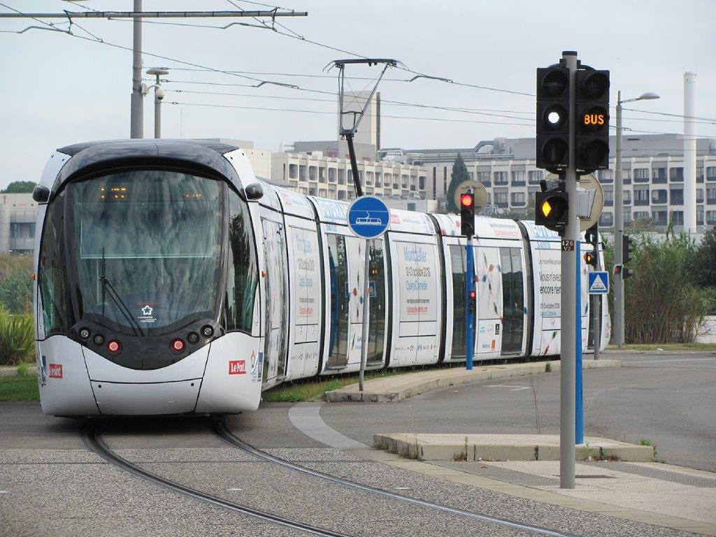 Clap de fin sur le pelliculage FuturaPolis Santé deuxième édition revêtu par la rame 2099 Citadis 402 Alstom depuis le jeudi 20 septembre 2018. Photo prise rue Zamenhof, quartier Celleneuve à Montpellier, le samedi 13 octobre 2018. Copyright : Edouard Paris