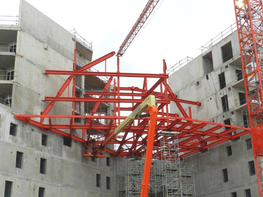 Structure en acier du futur bâtiment pont de l’ensemble architectural « Hôtel St-Roch – Belaroia » photographiée le vendredi 12 octobre 2018. Copyright : Anje34