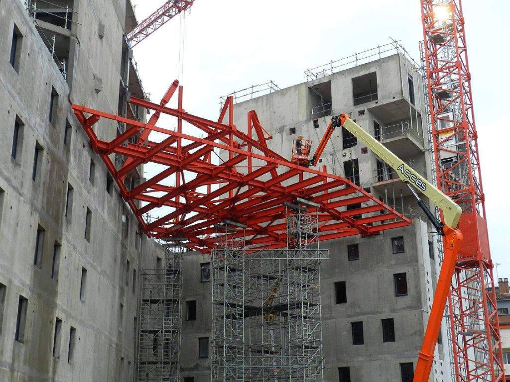 Structure en acier du futur bâtiment pont de l’ensemble architectural « Hôtel St-Roch – Belaroia » photographiée le mardi 16 octobre 2018. Copyright : Anje34