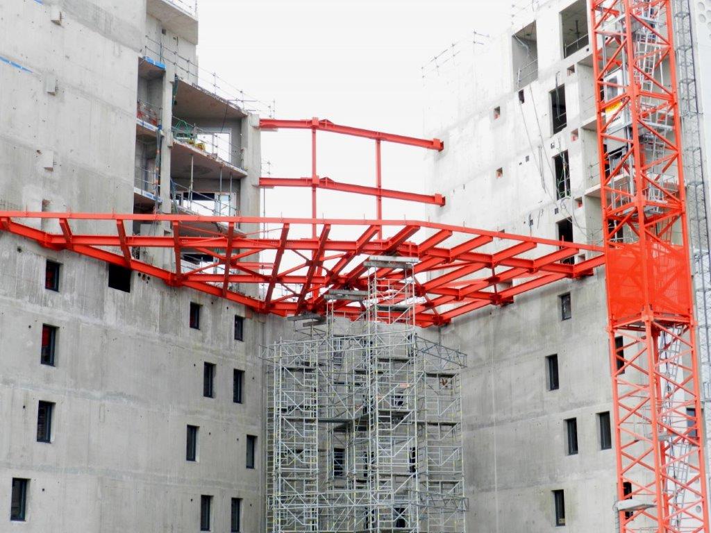 Structure en acier du futur bâtiment pont de l’ensemble architectural « Hôtel St-Roch – Belaroia » photographiée le jeudi 18 octobre 2018. Copyright : Anje34