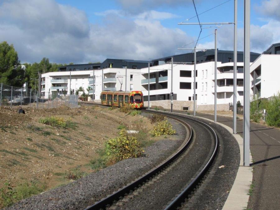 Juste après avoir quitté le terminus « Jacou », la rame 2059 Citadis 302 Alstom longe des immeubles récents de l’éco quartier du Domaine de Caylus à Castelnau-le-Lez, le dimanche 7 octobre 2018. Copyright : Edouard Paris