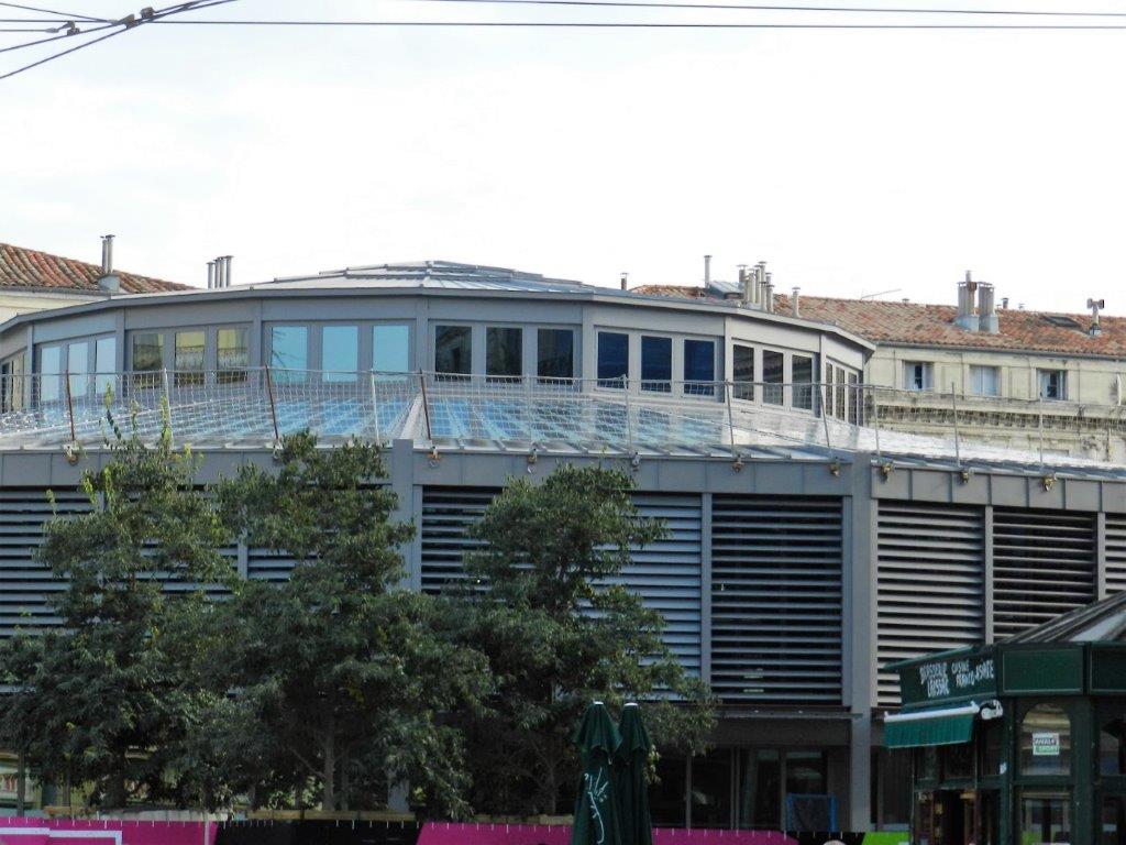 L’installation des panneaux photovoltaïques sur la toiture des nouvelles halles de la place Alexandre-Laissac à Montpellier, dont l’inauguration est fixée au samedi 1er décembre 2018 à 11h00, est toujours en cours. Photo prise le vendredi 19 octobre 2018. Copyright : Anje34