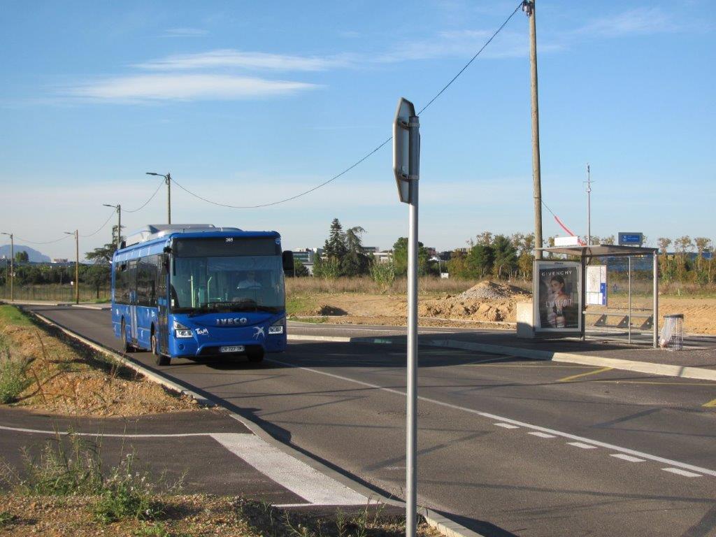 A droite, un abribus JCDecaux de l’arrêt « Cambacérès » à Montpellier côté parvis nord-ouest de la gare de Montpellier Sud de France. Photo prise le mardi 23 octobre 2018. Copyright : Edouard Paris