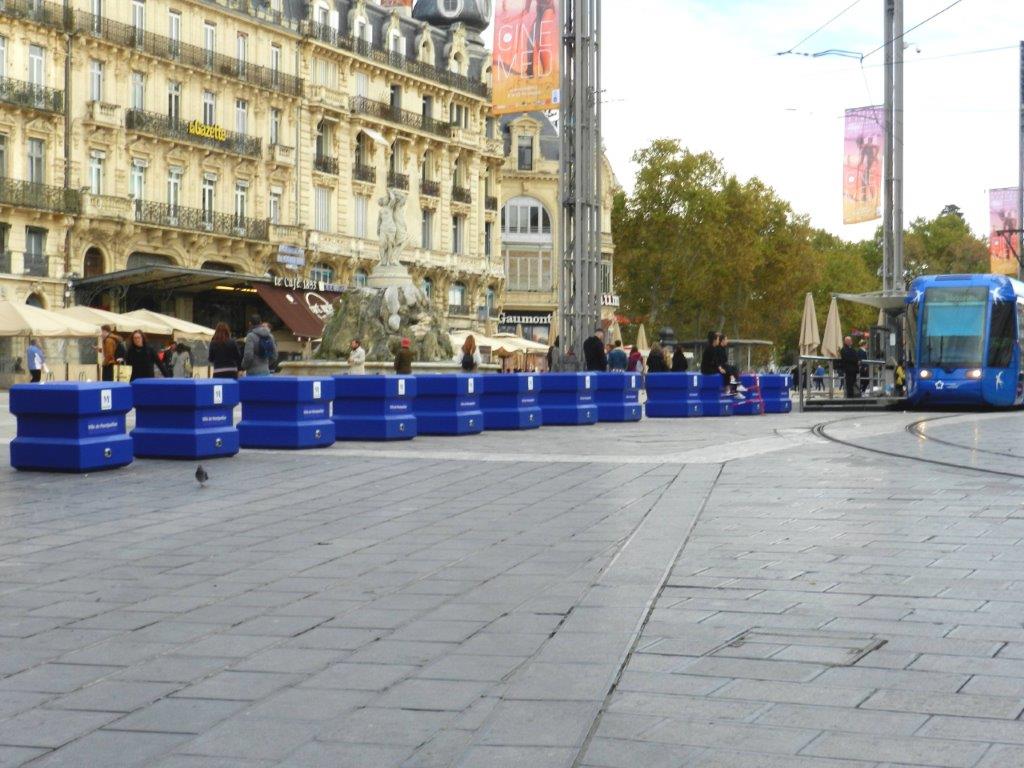 Place de la Comédie à Montpellier, les « blocstop » ont remplacé les blocs de béton ô combien inesthétiques. Photo prise le dimanche 28 octobre 2018. Copyright : Anje34