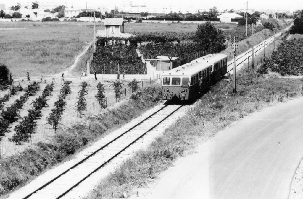 Le Petit Train de Palavas, assuré par l’autorail De Dion-Bouton Z-701 et sa remorque pilote R-1, passe à la hauteur de ce qui deviendra par la suite le complexe sportif de La Rauze à Montpellier. Photo prise par Rolland Martin en 1968. Collection jp autié