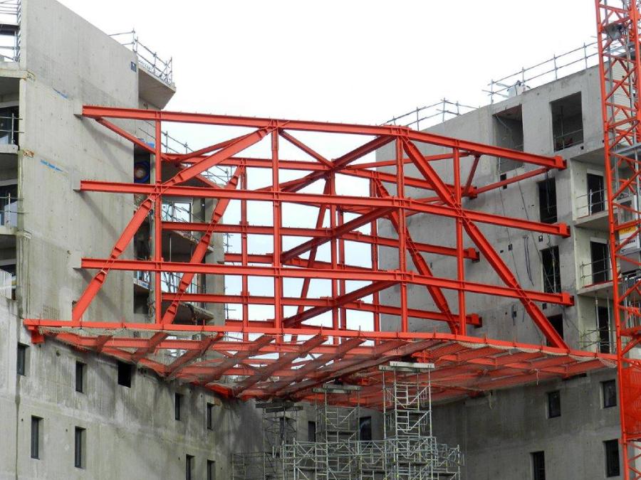 Structure en acier devant servir à la construction du bâtiment pont de l’ensemble architectural « Hôtel St-Roch – Belaroia » photographiée le dimanche 28 octobre 2018. Copyright : Anje34