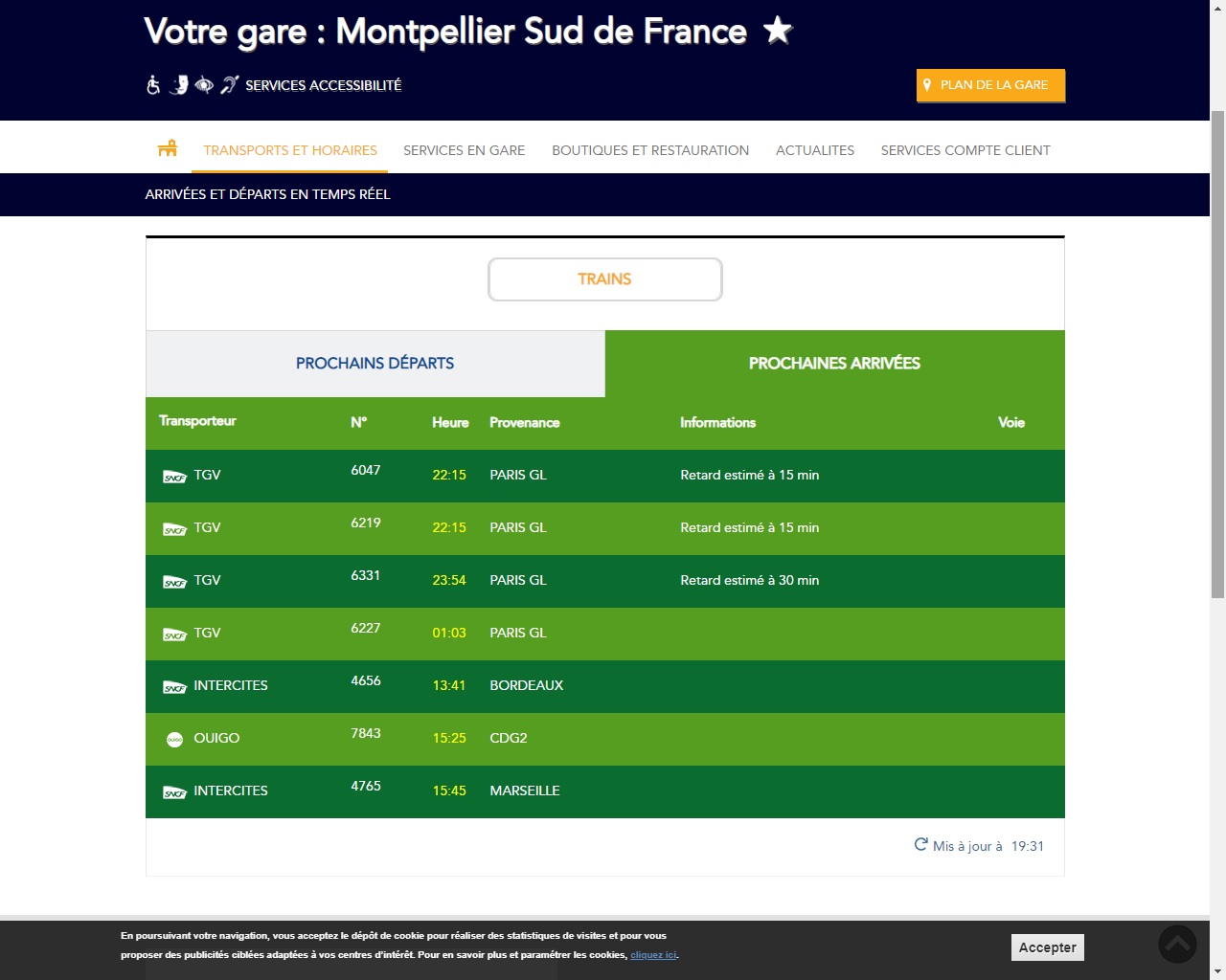 Capture d’écran de l’horaire d’arrivée du TGV n°6227 Paris gare de Lyon – Montpellier Sud de France, le vendredi 9 novembre 2018 sur le site gare-sncf.com à 19h31