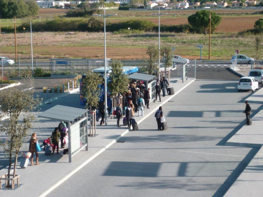 Parvis sud de la gare de Montpellier Sud de France, les voyageurs du Ouigo arrivé à 15h25 prennent d’assaut la navette bus à destination de « Place de France », le samedi 3 novembre 2018 à 15h33. Copyright : Edouard Paris
