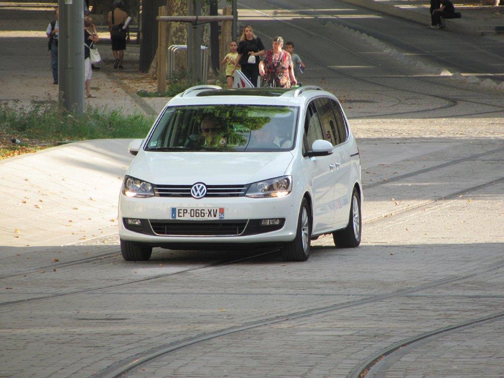 Le mauvais exemple français : la voiture, une Volkswagen à motorisation diesel, du premier magistrat de la ville de Montpellier, photographiée le jeudi 21 juin 2018, place Albert 1er sur les rails du tramway. Copyright : Edouard Paris