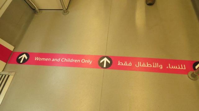 Marquage au sol dans une rame Citadis 402 Alstom du tramway de Dubaï indiquant qu’au-delà de la limite les places debout et assises sont réservées aux femmes et enfants. Photo prise le mardi 21 avril 2015. Copyright : DS7
