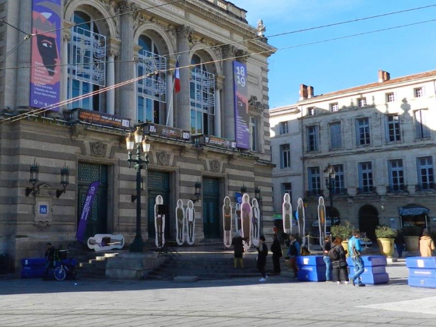 Le samedi 24 novembre 2018, douze silhouettes symbolisant les femmes qui, chaque mois, perdent la vie en France sous les coups de leur conjoint ou ex-conjoint, ont été installées au pied de l’Opéra Comédie de Montpellier. Copyright : Anje34