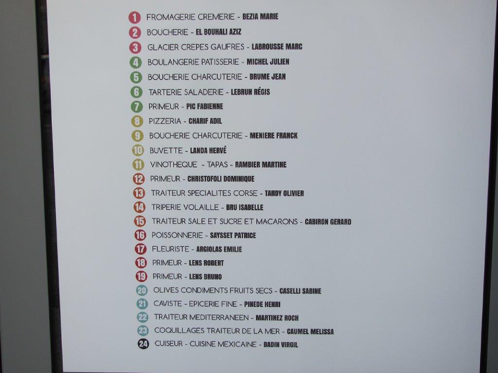 Liste des 24 étaliers des nouvelles halles Laissac consultable aux six entrées du marché couvert. Photo prise le samedi 1er décembre 2018. Copyright : Edouard Paris