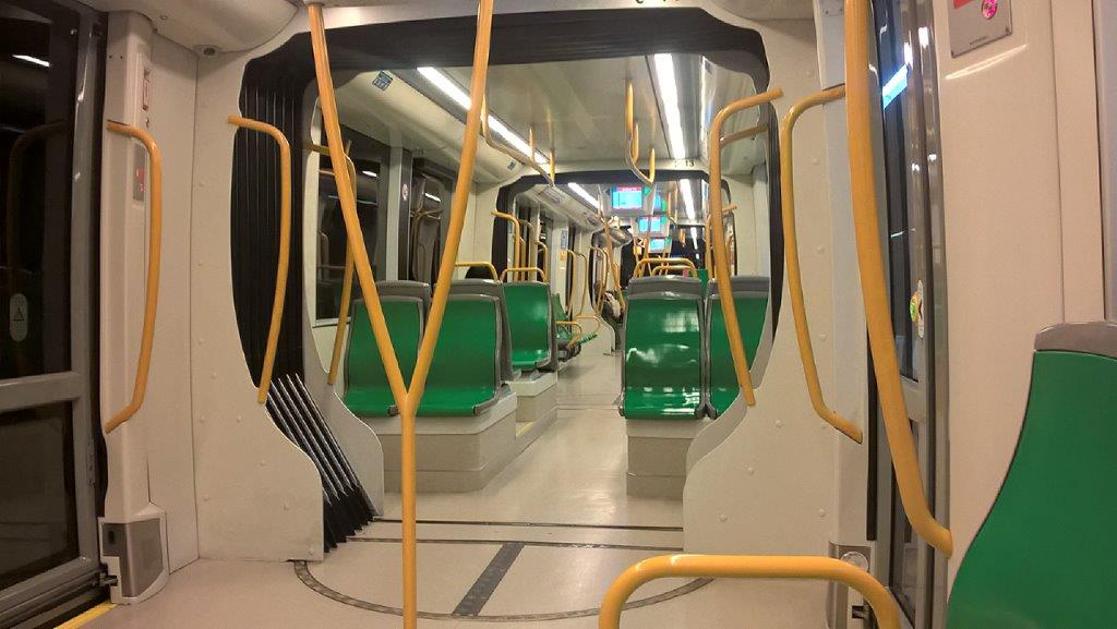 Aperçu de l’aménagement intérieur d’une rame Urbos 3 CAF du métro de Malaga, le samedi 27 octobre 2018. Copyright : Edouard Paris