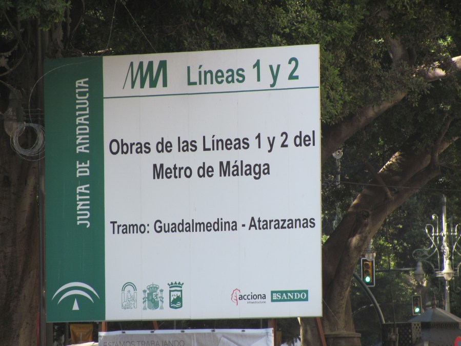 Panneau d’information sur les travaux d’extension des lignes du métro installé sur Alameda Principal à Malaga, en bordure du centre historique. Photo prise le jeudi 25 octobre 2018. Copyright : Edouard Paris