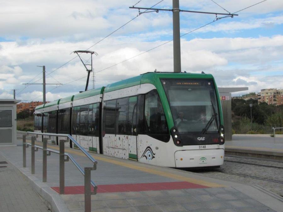 La rame 3140 Urbos 3 CAF, circulant en direction du terminus « El Perchel », est photographiée à la station « Clinico » de la ligne 1 du métro de Malaga, le samedi 27 octobre 2018. Copyright : Edouard Paris