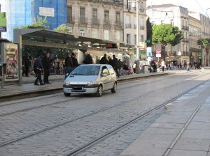 5 décembre 2018 – Rue de la République et boulevard de l’Observatoire à Montpellier, les intrusions sur la plateforme du tramway par des véhicules non autorisés sont monnaie courante