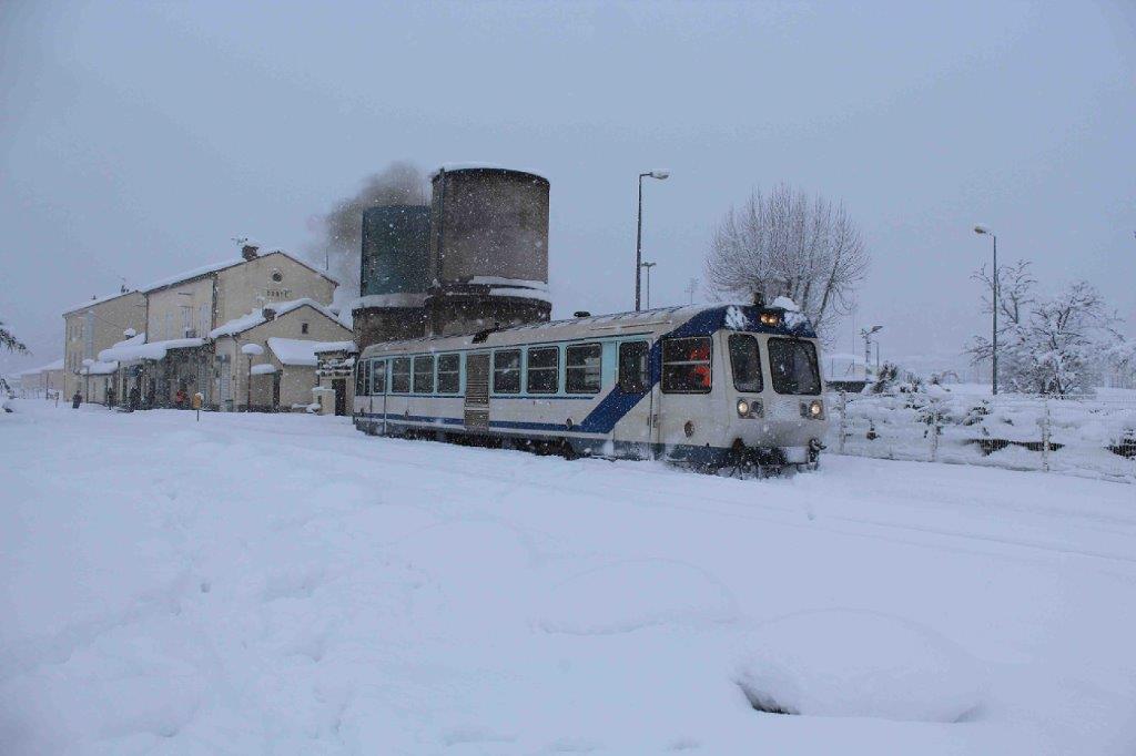 L’autorail X 97054 Soulé CFD est photographié sous la neige au moment où il quitte la gare de Corte, le mardi 17 janvier 2017. Copyright : Marius d’Oriano