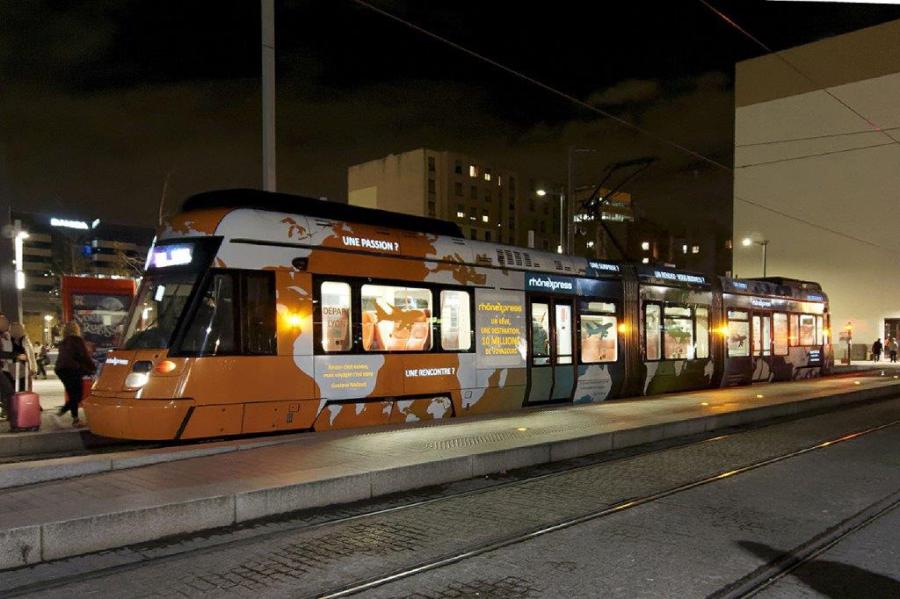 La rame 103 Tango Stadler rhônexpress à la livrée dotée de parties adhésives lumineuses, grâce à un mécanisme électroluminescent conçu par la société lyonnaise Was Light, photographiée au terminus « Gare Part-Dieu – Villette », le dimanche soir 9 décembre 2018. Copyright : Yvon Brument