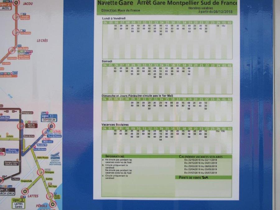 Fiche Horaire de la navette bus au nouveau terminus « Gare Montpellier Sud de France » photographiée le samedi 15 décembre 2018. Copyright : Edouard Paris