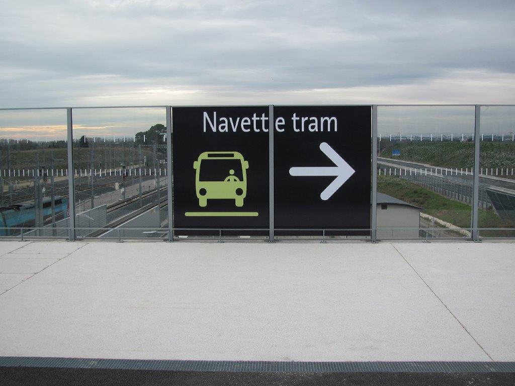 Signalétique « Navette tram » visible sur la terrasse du parvis ouest de la gare de Montpellier Sud de France. Photo prise le samedi 15 décembre 2018. Copyright : Edouard Paris