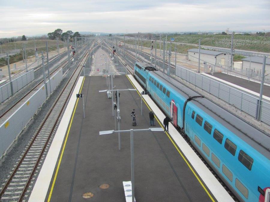 Le Ouigo, composé de deux rames TGV Duplex, arrivé de Tourcoing avec trente minutes de retard (13h02 au lieu de 12h32), va repartir en sens inverse en direction de Marne la Vallée – Chessy à 14h49. Photo prise côté parvis ouest de la gare de Montpellier Sud de France, le samedi 15 décembre 2018. Copyright : Edouard Paris